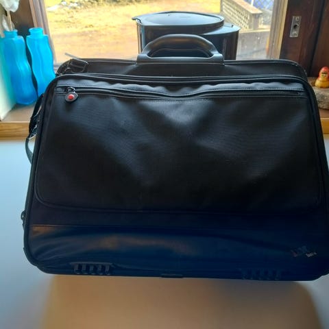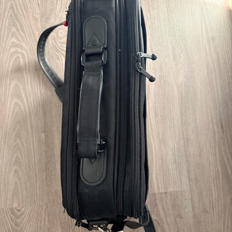 Musta Thinkpad tietokonelaukku, olkahihnalla.