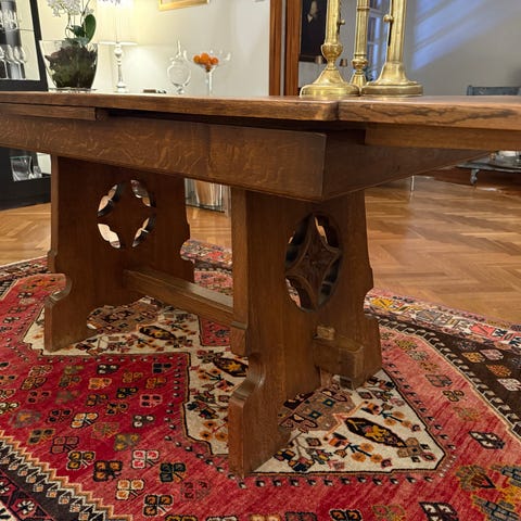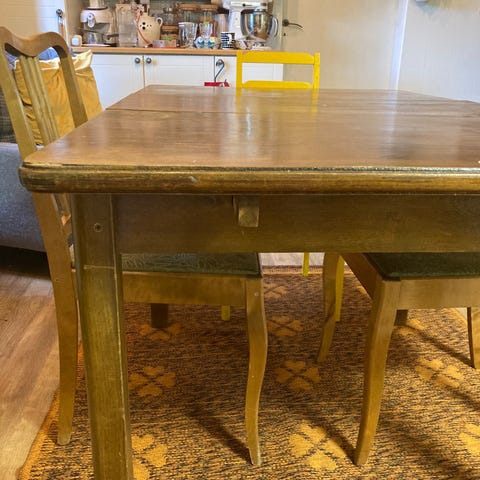 Vanha keltainen pöytä. Vaatii paikkausta. Jalat irroitettavat. Vain nouto Turusta.