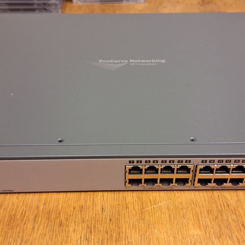 HP:n 24-porttinen giganen hallittava kytkin 19" räkkiin. Yläpään neljä porttia dual personalityjä.