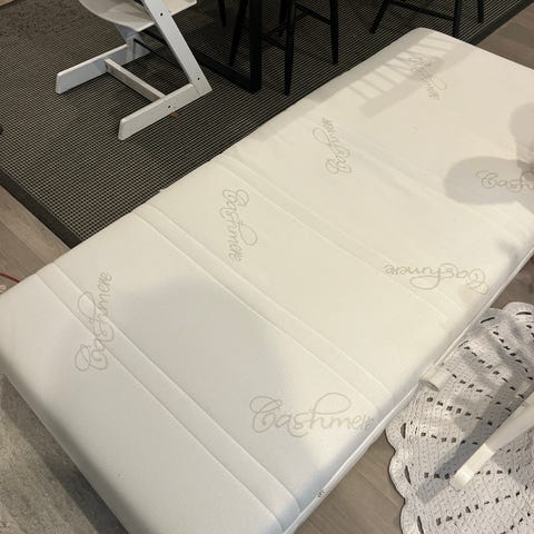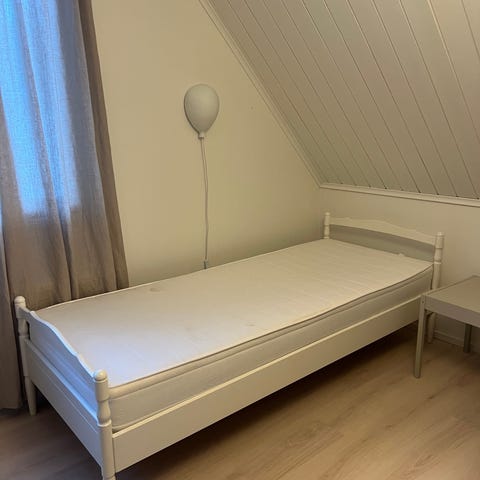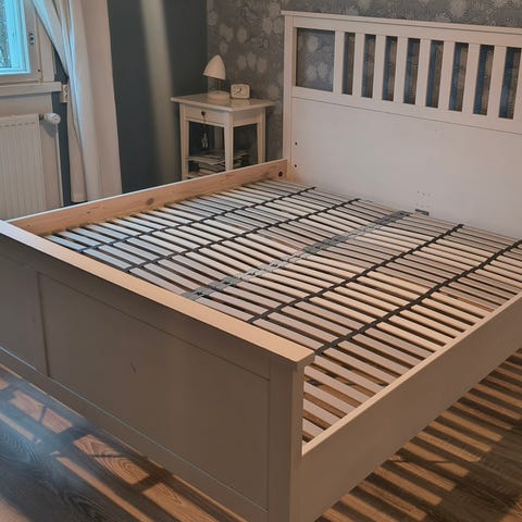 Sänky 180×200cm. Kuvassa jalkapääty. Etupääty on korkeampi. Pohjana todella tukeva säleikkö ja tukijalka. Kulmiin lisätty tukiraudat.
