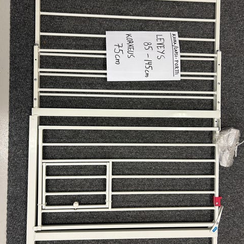 Valkoinen metalli turvaportti, joka soveltuu portaisiin, oviin tai muuhun tilan rajaukseen Portti on suunniteltu estämään lasten pääsy portaisiin tai muihin vaarallisiin alueisiin. Korkeus 73cm, leveys säädettävissä jatkopalalla, 100-130cm