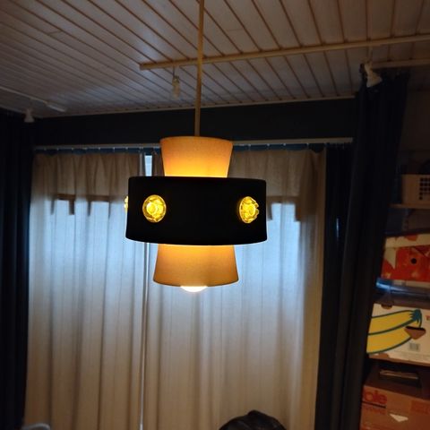 Erittäin siro kattovalaisin messinkirungolla. Ikää on vaikea määritellä mutta alkuperäisistä osista päätellen 60 tai 70-luvulta. Valaisin on kunnostettu ja toimiva. Korkeus n. 30 cm (+ketjut n. 30 cm) leveys n. 23 cm. Nouto ja käteinen tai toimitus Lieto (+/- 30 km) pientä korvausta vastaan.
