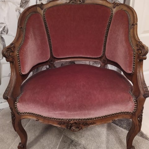 Nojatuoli nro kaksi, talonpoikaisrokokoo, kotimaisen Laitala Oy:n selkänojallinen nojatuoli, samettipäällys, myydään rekvisiittakäyttöön tai esim. verhoiluharjoitusta tms. varten. Tuolin jousitus rikki ja pitää korjata. Hinta 20 €/kpl. Nouto, käteismaksu. Tuoli yksi jo MYYTY.