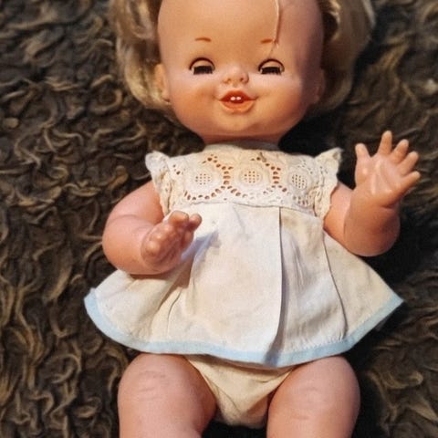 Iloisen ilmeen omaava ihana retro nukke etsii uutta leikkijää, uutta äitiä. Tai vaikka somisteeksi hyllylle