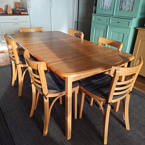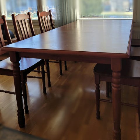 Todella tukevat pöytä + tuolit pöydässä jatkopala 45 cm eli pituutta jatkon kanssa 220cm, kuva 175cm pitkänä.