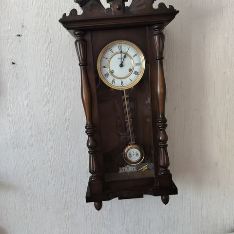 Kellon leveys 41 cm ja korkeus noin 18 cm. Avain tallella ja siinä teksti: Hermle. Kello ei käy, mutta kellon sisällä olevien tietojen mukaan se on huollettu ainakin vuosina 1977 ja 1982. Jonkin verran käyttökulumaa. Kellotaulun alla oleva hopealaatta kertoo, että kello on saatu lahjaksi vuonna 1967. Ostaja vastaa toimituskuluista, ellei nouto.