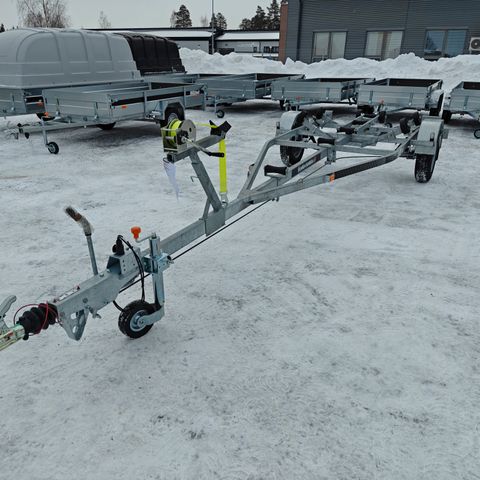 Trailermate 3 000 kg jarrullinen venetraileri on suunniteltu keskisuurille ja suurille veneille. Tämä erittäin kestävä ja luotettava venetraileri, jonka kantavuus on 2 340 kg ja kokonaismitat 788 x 231 cm. Trailermate jarrullinen 2-aks. 788 x 231 cm venetraileri on meidän suunnittelema traileri, jonka umpipalkkirunko takaa varman kestävyyden ja vakaan vedettävyyden. Rullien suuri määrä auttaa jakamaan veneen kuorman trailerin päälle tasaisesti. Vakiona olevat ylös nostettavat takavalot ja rungon kulkusilta tuo käyttömukavuutta ja turvallisuuttaa. Trailermate-venetraileri on erinomainen valinta niille, jotka etsivät luotettavaa ja kestävää venetraileria, joka on helppo käyttää ja huoltaa. Kärryissä aina 2 vuoden tehdastakuu sekä rekisteröinti sisältyy hintaan.