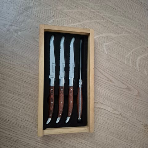 Liha- ja kalaruokien paloitteluun ja tarjoiluun tarkoitettu setti. Ruostumatonta terästä ja kädensijat jalopuuta.