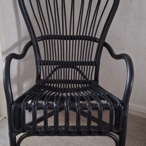 Näyttävä paksusta aidosta rottingista punottu nojatuoli, Siistit muhkeat pehmusteet sisältyvät hintaan.