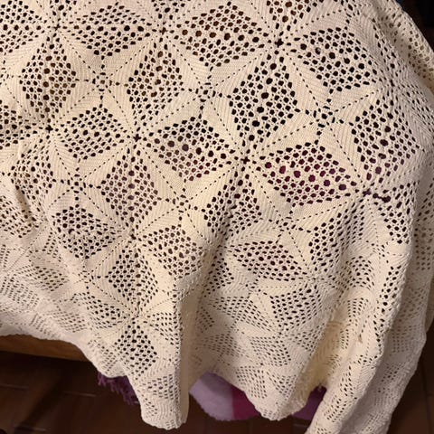 Kuvienmukainen, hyväkuntoinen käsinvirkattu (Suomessa) vintage päiväpeitto.