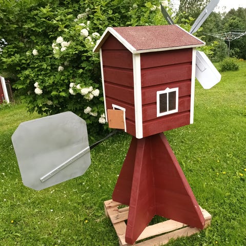 Myllyn korkeus siiven kärkeen 150 cm. Valmistettu puusepänkuivasta männystä ja maalattu kahteen kertaan. Tuulimyllyn saa helposti neljään osaan kuljetusta varten, joten sopii henkilöautoon.