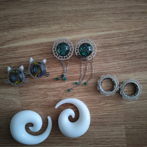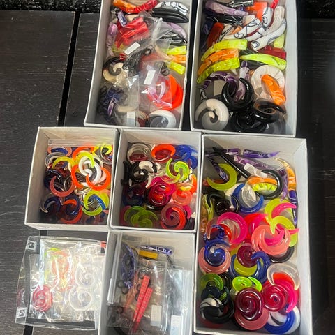 Venytyskoruja ym. Suurin osa käyttämättömiä, osa kokeiltu mutta steriloitu. Parit varspatterit mukaan loistaviin koruihin. Löytyy 16mm, 18mm, 1mm, 3mm kokoisia.