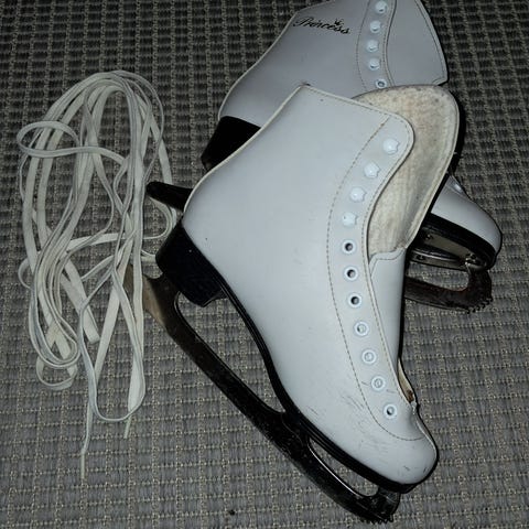 Myydään valkoiset, vaaleansininen sisusta, Bride-merkkiset, vähän käytetyt kaunoluistimet. Koko 35. Pintamateriaali kuvioitu. Terien piikeistä osa poistettu.