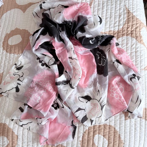 Marimekon Pamba Klaava villahuivi, koko noin 118 x 117 cm. Ohut läpikuultavaa ja pehmeää. Villaa 44 %, modaalia 40 %, silkkiä 12 % ja cashmereä 4 %. Hyvässä kunnossa.