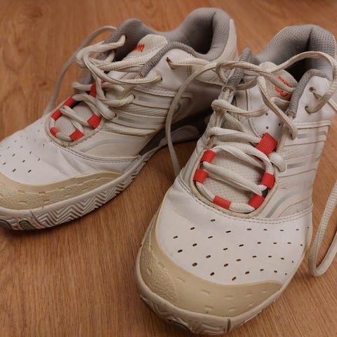 Tenniskengät. Pelattu punamullalla. Pesty mutta ei lähtenyt kaikki pois.