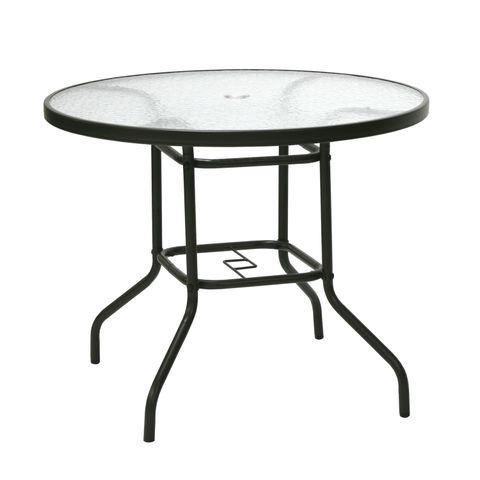 Tuote on säänkestävä. Pöytälevy: 5mm läpinäkyvä lainelasi, teräsrunko, väri: tummanruskea