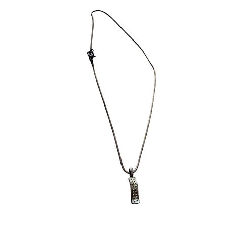 Hopeanvärinen metallinen palloketju, jossa metallinen riipus mustilla helmillä, jotka ilmeisesti lasia. Hyvä käytetty kunto, vähäistä käyttökulumaa/ajan tuomaa patinaa. Riipuksessa kaikki kivet tallella - kenties markasiitteja. Ketjussa papukaijalukko.
