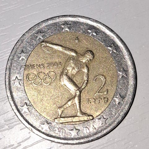 2e keräilykolikko Athens 2004. Tavallista käytönjälkeä mitä kolikoissa yleensä on.