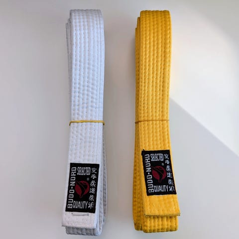Ja yksi vöistä ei ole valkoinen, vaan ohuella keltaisella raidalla. Eli Hokutoryun junnuvyö.