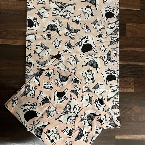 Hyvässä kunnossa oleva puuvillainen pussilakanasetti, sisältää tyynyliinan ja peittolakanan. Kaksipuolinen, toinen valkoinen ja toinen vanharoosa.