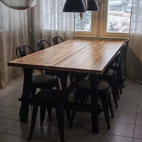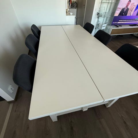 Myydään Ikean jatkettava Nordviken ruokapöytä (210/289x105 cm) ja kahdeksan Finnlandia-kalusteen tuolia muuton vuoksi.