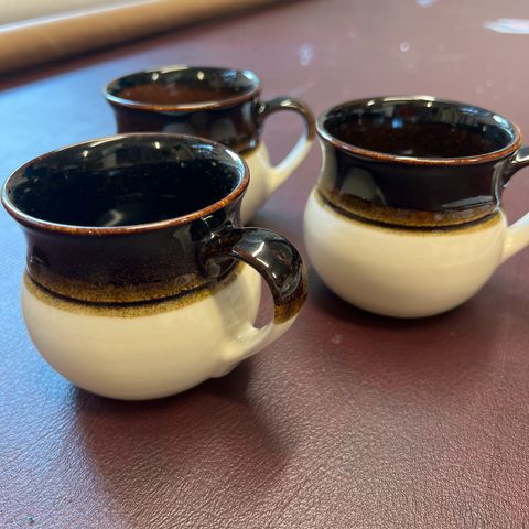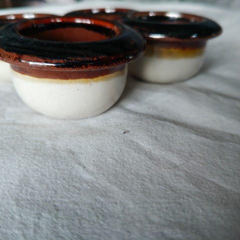 Neljä tummaa Kermansaven munakuppia, vanhempaa mallistoa.
