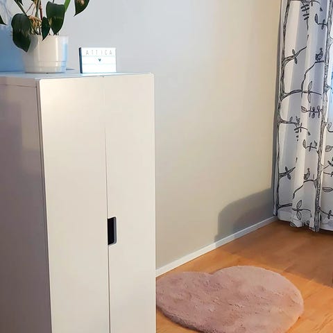 Avaamattomassa paketissa oleva valkoinen Ikean Veddinge kaapinovi.