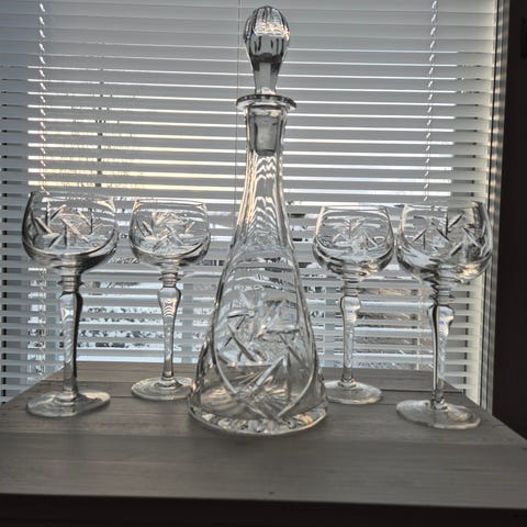 Käyttämätön kristallinen viinikarahvi ja vähän käytetyt kristalliset viinilasit 4kpl.