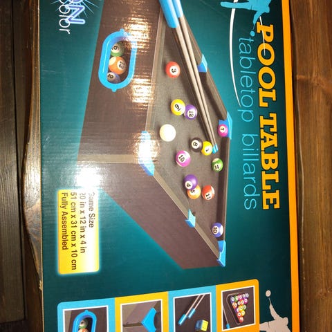 Att spela biljard är roligt och detta behändiga biljardbord kräver inte mycket utrymme! I förpackningen ingår ett biljardbord ( 51 x 31 x 10 cm), två spelköer, bollar, en triangel och en vit krita. Rekommenderad ålder: från 5 år.