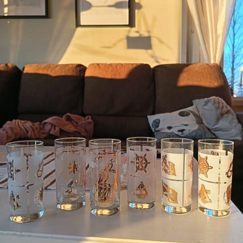 4 kpl laiva-aiheisia laseja kultareunuksella. Kultaus hieman kulunut. Korkeus 10 cm, halkaisija 7,5 cm.