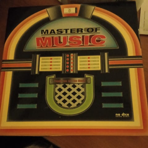 Musiikki-aiheinen triviapeli, jossa muuten kaikki osat, mutta 3/6 pelinappulaa hukassa.