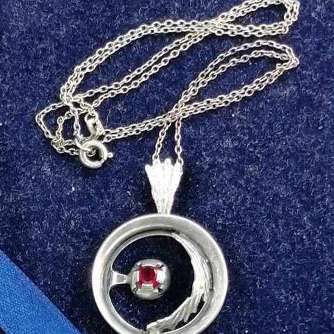 Martti Viikinniemen suunnittelema hopeinen ristiriipus, koko 3.5 cm x 6 cm. Leimat MV, kruunu, 830.