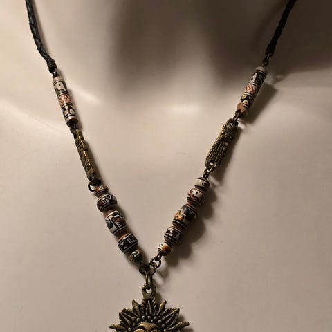 Nahkaremmiin punottu kaulakoru, kaksin kertainen, tummanruskeaa nahkaa.