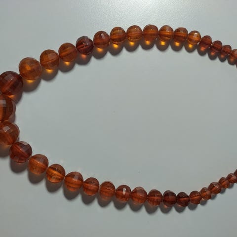 Meripihkahelmet, kolmea eri sävyä helmissä, kokonaispituus 54 cm. Helmien punonta hyvä, solmut helmien välissä.