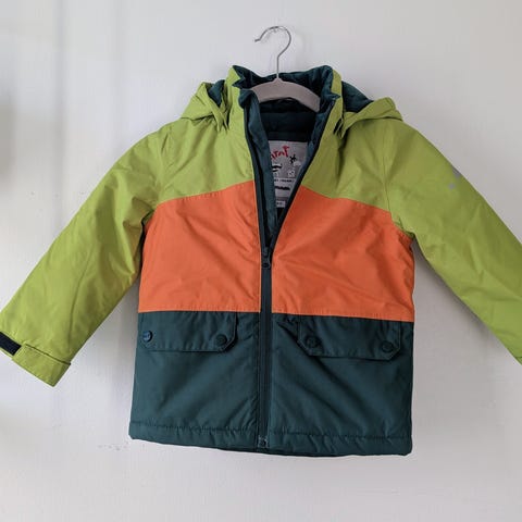 Harmaa lämmin toppatakki koko 92. Taskut ja irrotettava huppu. Ollut meillä kauppa/autotakkina.