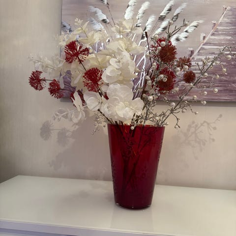 Vihreää lasia, korkeus noin 22,5 cm ja halkaisija noin 11,5 cm, ehjä, reuna täysin suora ylhäältä alas asti (kuva vähän vääristää, että olisi eri halkaisija ylhäällä ja alhaalla...), Pentik -tarra vielä jäljellä, kun en ole ikinä laittanut tähän kukkia, ollut vain kaapin täytteenä tämäkin......