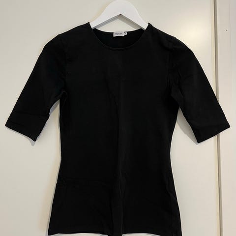 Musta Filippa K paitapusero Crepe Jersey Blouse. Kokomerkintä xs, mutta menee helposti ainakin s-koossa väljän mallin ansiosta. Materiaali on hieman läpikuultavaa, mutta kangas silti painavaa ja hyvin laskeutuvaa. Ei myöskään rypisty. Hihat ovat lepakkomaiset, muuten vartalon kohdalta tyköistuvampi, mutta ei tiukka. Materiaali 80% viskoosi, 20 % polyamidi. Hajusteeton.