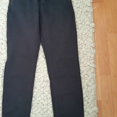 Mustat suorat housut Espritiltä, edessä ja takana taskut (takana napilliset), lisäksi mukana housuihin kuuluva ohut ruskea vyö. Materiaali 98% puuvillaa, 2% elastaania pientä joustoa tuomaan. Istuvat hyvin lantiolta ja takapuolesta, lahkeet reidestä istuvammat ja polven alapuolelta leveämmät, vyötärö n.74 cm.
