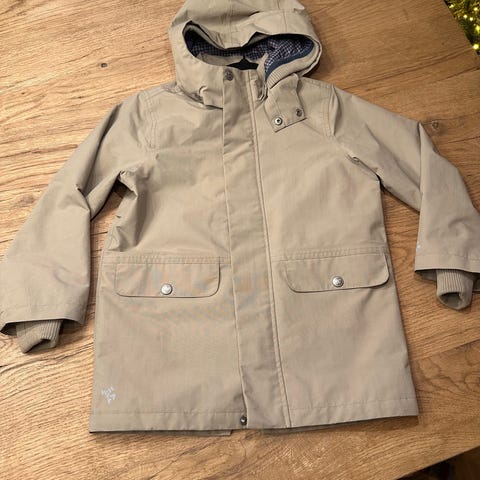 Siistikuntoinen vähän käytetty tuulitakki. Kangas ohutta, hieman kahisevaa. Sisäpuolella yksivärinen ohut vuorikangas. Hihansuissa, helmassa ja kaula aukossa leveät joustavat resorit. Etupuolella avotaskut.