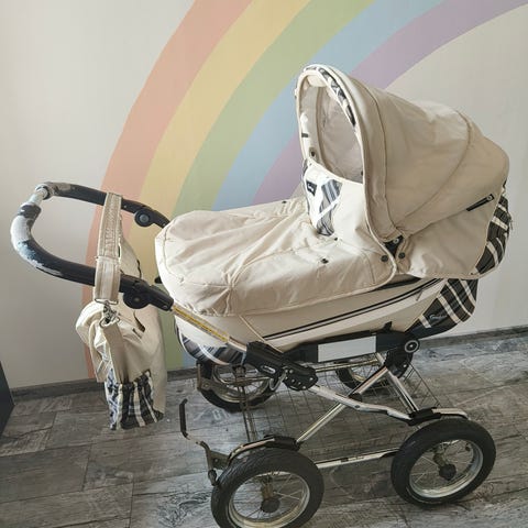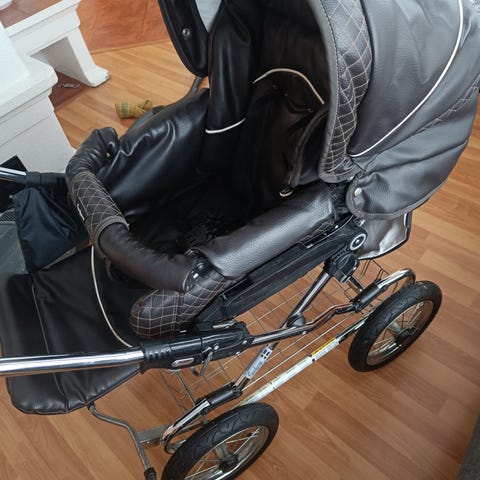 Työntöaisan nahka ja alakorin kangas jo kuluneet, mutta muuten ei juurikaan. Työntöaisan ja korin saa toki halutessaan ostettua uuden, jos häiritsee liikaa.