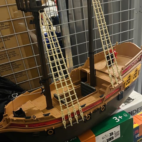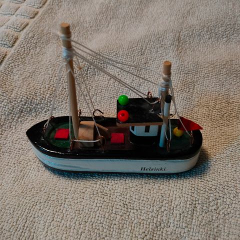 Perässä vedettävä monipuolinen laiva. Puuta. Kestävä. Käytön jälkeä ja kolhua toki on. Näkyy kuvissa.