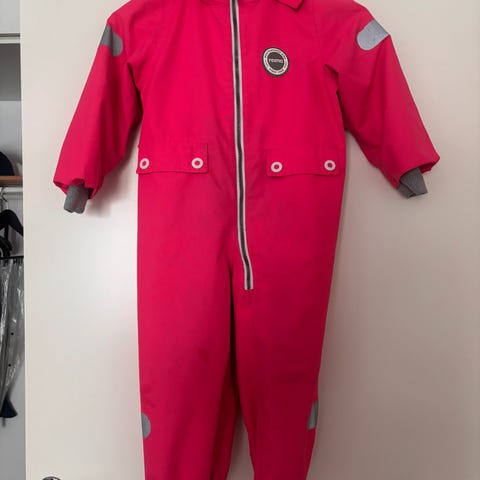 Reiman vuoreton välikausihaalari, koko 98. Punainen, pieniä kukkakuvioita. Käytetty kunto, mutta siisti pihahaalariksi. Ehjä, hihansuissa, lahkeensuissa ja kumilenkeissä kulumaa. Varahaalariksi ym