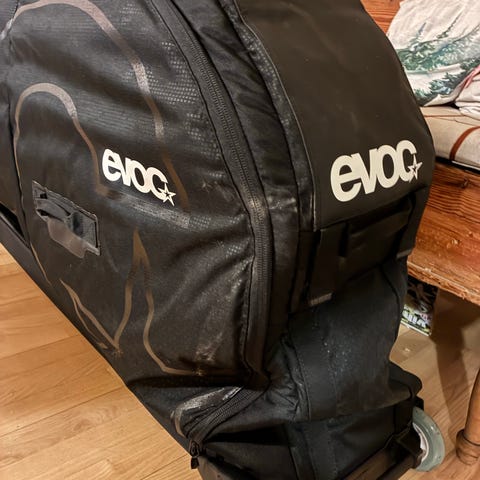 Evoc pyörälaukku pyörän kuljetukseen. Ei mahdu 29” maastorenkgas. Eli alle 29” mahtuu. Etukahvan yksi kulma revennyt, mutta ei vaikuta käyttöön tai suojaukseen.