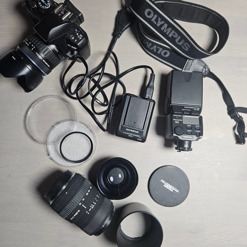 Olympus e-420 kit 45mm objektiivilla. Mukaan lähtee myös 150mm objektiivi, laturi ja akku. Täysin toimiva setti, tästä vaikka aloittelevalle kuvaajalle.