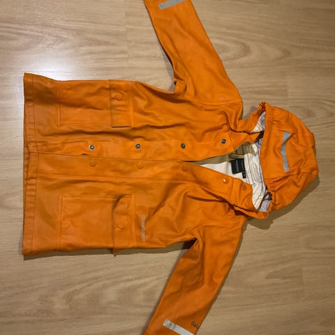 Didriksonsin siisti sadetakki, koko 100. (Valikosta löytyi vain 104.) kauluksessa pehmeät fleecekaistaleet. Helmassa nauhakiristysmahdollisuus, hihansuissa kahdet nepit. heijastinnauhat hihoissa ja selässä.