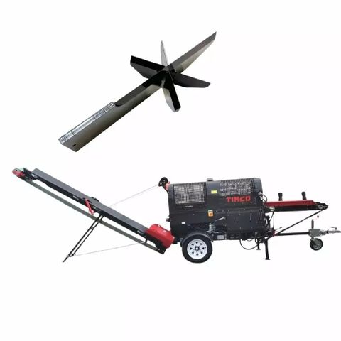 Timco 12T pilkekone automaattisella sahauksella ja hihnakuljettimella tekee kaikki neljä erillistä toimintoa yhdellä paketilla. Se kuljettaa, katkaisee, halkaisee ja siirtää klapit suoraan säkkiin tai varastoon.