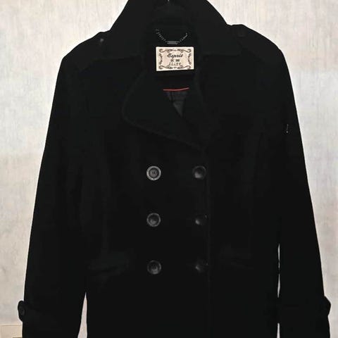 Ohut vuorinen villakangas takki. Pituus olkapää helma n. 96 cm. Kainalosta toiseen n. 57cm. Postitus käy.
