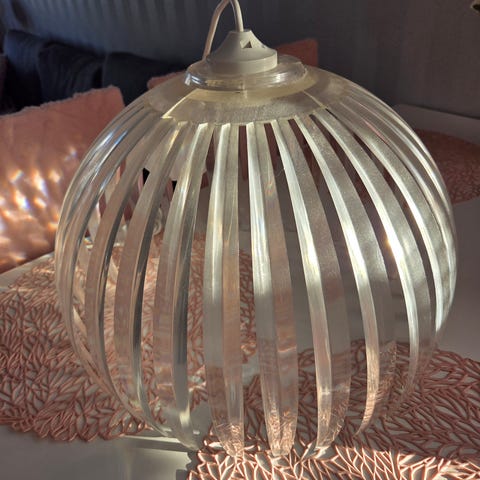 Ripustuskorkeus max. 130 cm, tangon leveys 75cm. Lasikuvut. Töpselikiinnitys. Alkuperäinen kiinnitystapa rikkoutunut, mutta nippusiteillä jopa parempi! Ks. Kuva. Valaisin muuten täysin virheetön. Kesämökille loisto ostos!