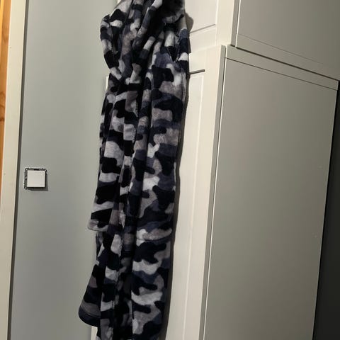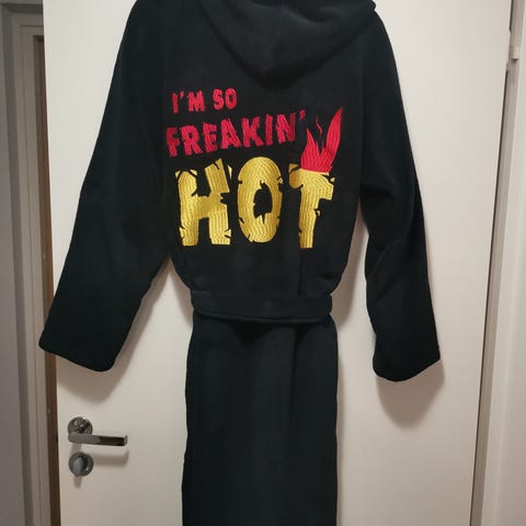 Koko L, hupullinen. Ehjä kylpytakki muuten paitsi lankoja on katkeillut ja ripustuslenkki on poikki. Tästä siistimisellä vielä käyttökelpoinen kylpytakki.