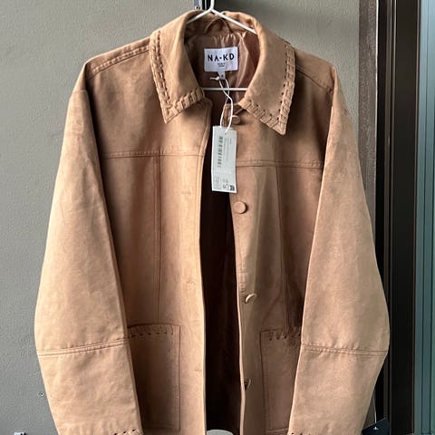 Juhlakäytössä ollut Nina Buzo takki kiiltävällä vuorella. Edessä taskut, lisäksi sisäpuolella vetoketjutasku. Kauluksessa, hihoissa ja selässä pieni koristeläpi.